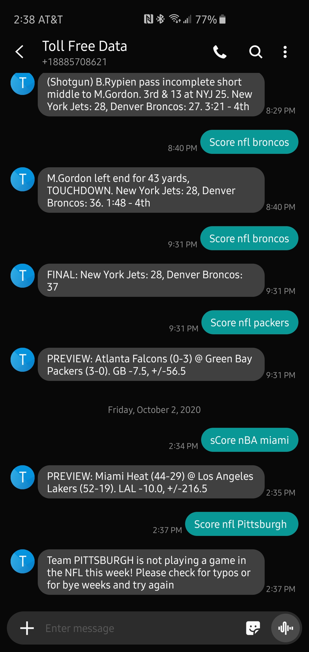 Just want a demo? Feel free to text 1-(888)-570-8621 with requests like "Score NFL Packers" or view the example below.